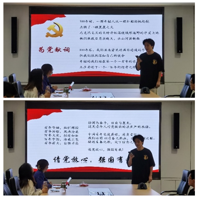 最后,党支书屈嘉惠带领支部全体进行理论学习。本次学习的主题是“深入学习贯彻习近平总书记‘七一’重要讲话精神”。今年是中国共产党成立100周年,7月1日上午庆祝中国共产党成立100周年大会在北京天安门广场举行,中共中央总书记、国家主席、中央军委主席习近平发表重要讲话,党支部成员通过视频一起回顾了当时的场景。
