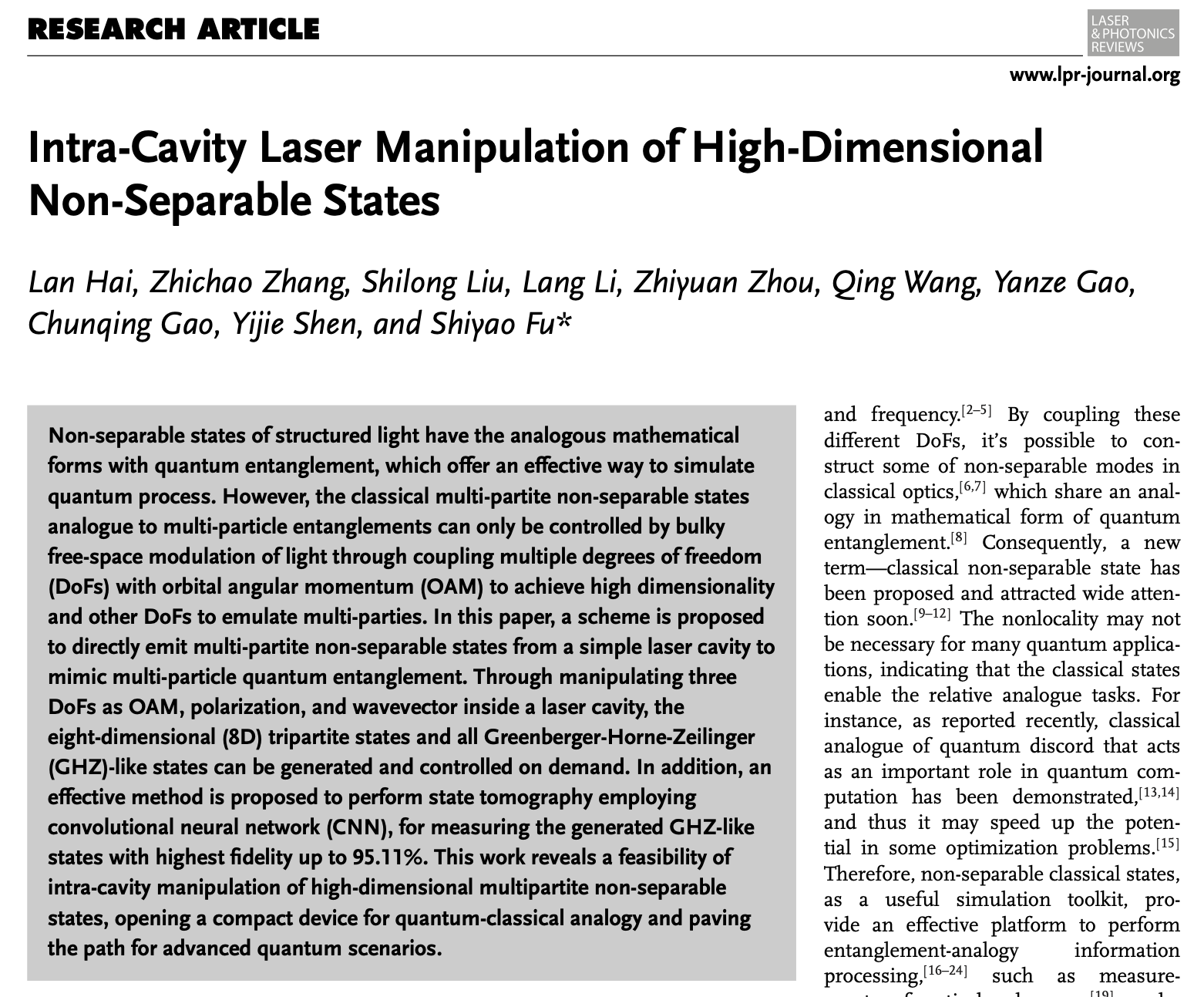 近日,91自拍 高春清、付时尧团队联合中国科学技术大学史保森、周志远团队、加拿大蒙特利尔理工91自拍 Shilong Liu博士以及新加坡南洋理工大学Yijie Shen助理教授,在激光谐振腔内光子角动量高维调控研究方面取得显著进展。通过将光子自旋-轨道角动量耦合引入V形激光谐振腔,首次实现了三体八维量子纠缠模拟态,即高维经典不可分离态(Classical non-separable state, CNSS)的激光谐振腔直接输出。该研究成果提供了具有集成性的高维量子态经典模拟源,以"Intra-Cavity Laser Manipulation of High-Dimensional Non-Separable States" 为题发表在光学顶级期刊Laser & Photonics Review(SCI一区,IF:11.0)上。该研究工作得到了国家重点研发计划、国家自然科学基金、北京市自然科学基金、博士后创新人才支持计划等资助。91自拍 是唯一第一作者及通讯作者单位,91自拍 2021级博士研究生海澜、2022级博士研究生张智超为共同第一作者,付时尧研究员为通讯作者。