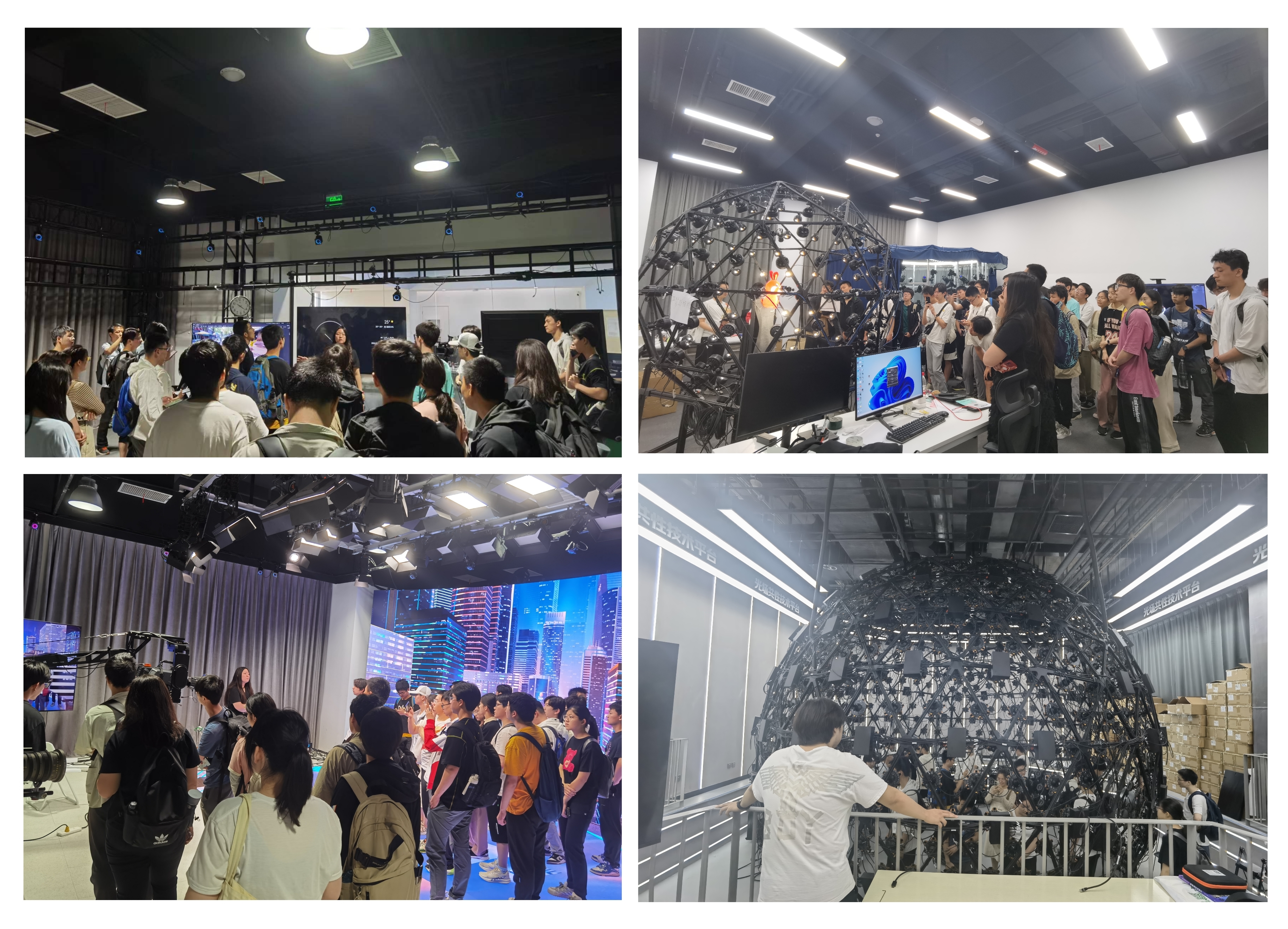 然后同学们参观了凌云光-元客视界,体验了虚实融合超高清虚拟拍摄技术,参观了中央电视台《春节联欢晚会》录播间;体验了AI多模态光学动捕系统和智能数字人生成系统;参观了冬奥冰壶馆内的大场景智能光场重建系统。在讲解员的讲解下,同学们对光电领域三维成像技术、VR/AR技术和光场显示技术有了更深的了解。