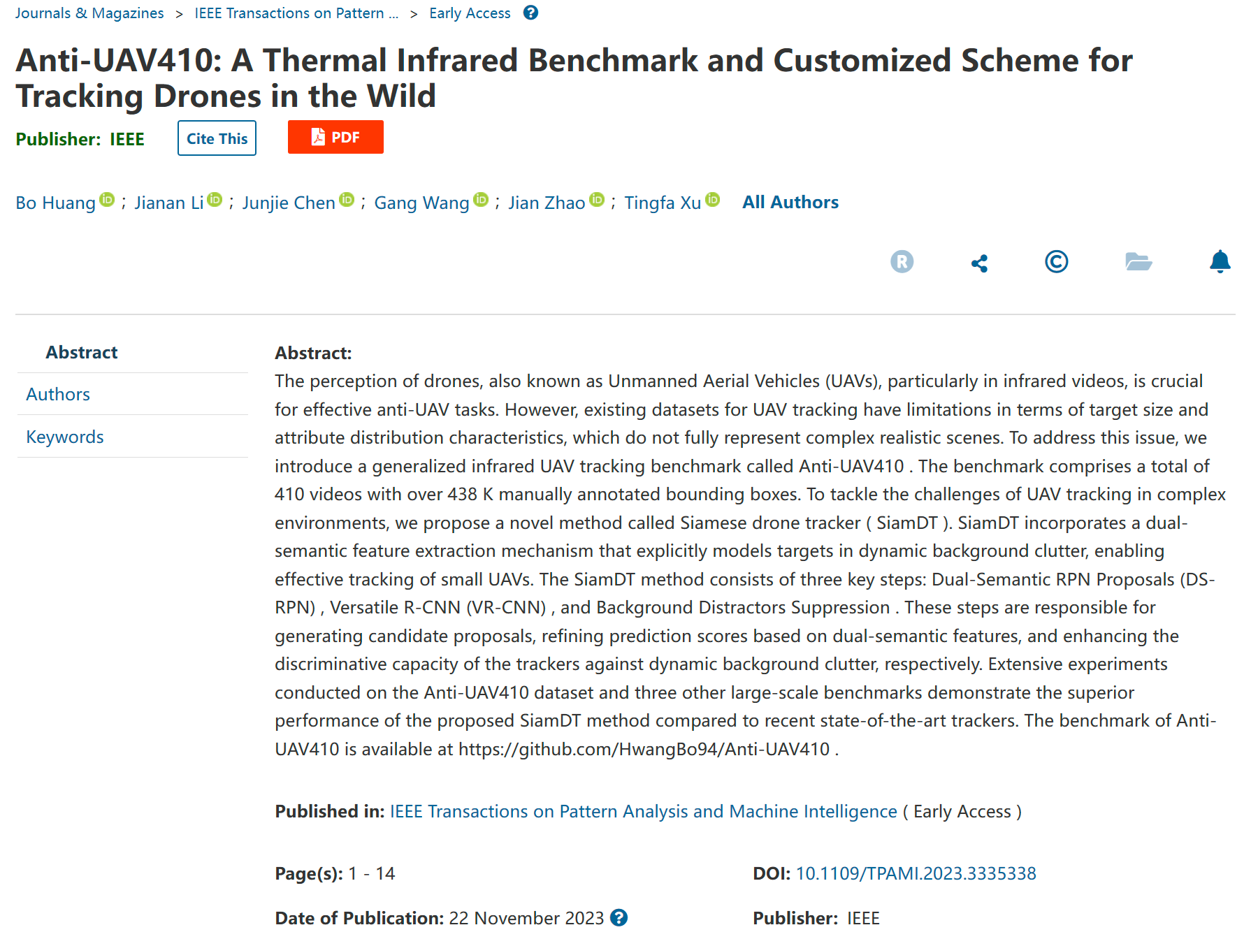 基于红外图像的智能目标探测技术是解决“低慢小”目标定位与跟踪的关键,同时也是国际学术前沿和国家重大工程需求。为了克服在复杂场景下红外小目标探测的难题,91自拍 的许廷发教授科研团队进行了智能化红外小目标定位与跟踪方法的研究,取得了突破性进展。该研究成果以“Anti-UAV410: A Thermal Infrared Benchmark and Customized Scheme for Tracking Drones in the Wild”为题,已在国际顶级期刊《IEEE Transactions on Pattern Analysis and Machine Intelligence (TPAMI)》上发表。IEEE TPAMI作为人工智能、模式识别、图像处理等领域的顶级权威期刊,其影响因子为23.6,同时也是中国计算机协会(CCF)推荐的人工智能领域A类期刊。