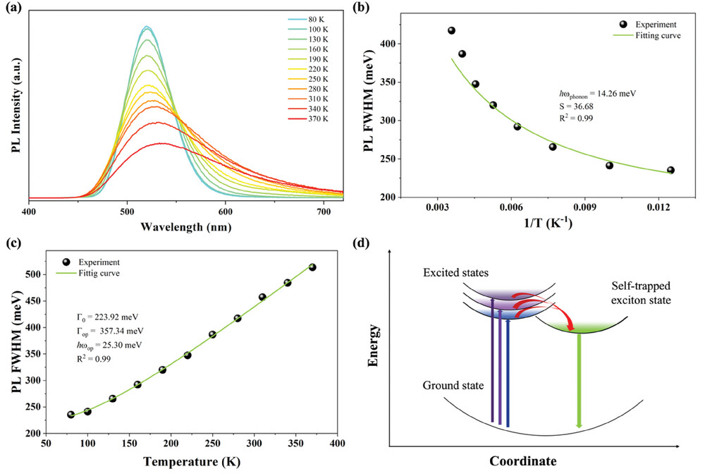 (TPP)2Cu4I6·2DMSO发光性能优异,其拥有横跨200-500 nm的超宽激发光谱,并且在紫外光激发下展现峰值位于515 nm的绿色宽带发射光谱,约78 nm的半峰宽以及85 nm的大斯托克斯位移,其荧光量子产率高达99.5%,是已有报道中最高效率的绿色发光材料之一。此外,其荧光寿命为2.53 s。将这些光学性质与理论计算的结果相结合,该团队猜测其发光行为与[Cu4I6]2-多面体及STE(自限域激子)有关。