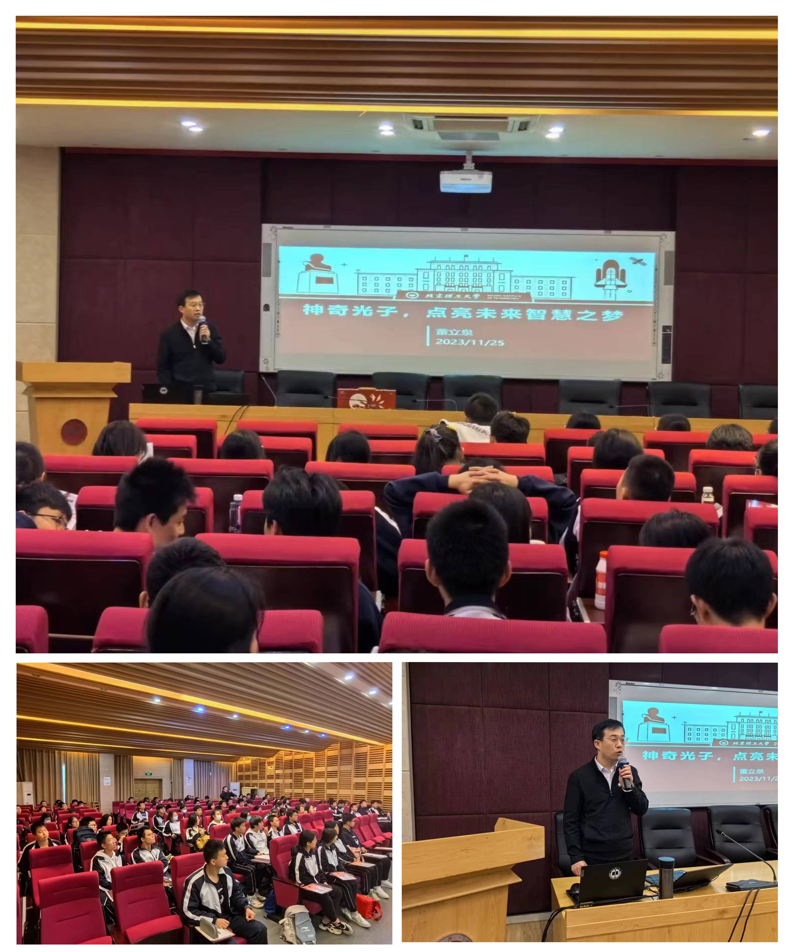 11月25日下午,招生组走访长沙市第一中学,董立泉面向高一师生做了以《神奇光子点亮未来智慧之梦》为主题的科普讲座,并播放北理工宣传片,讲座现场招生组为学生发放北理工宣传折页,讲座生动有趣,反响良好。