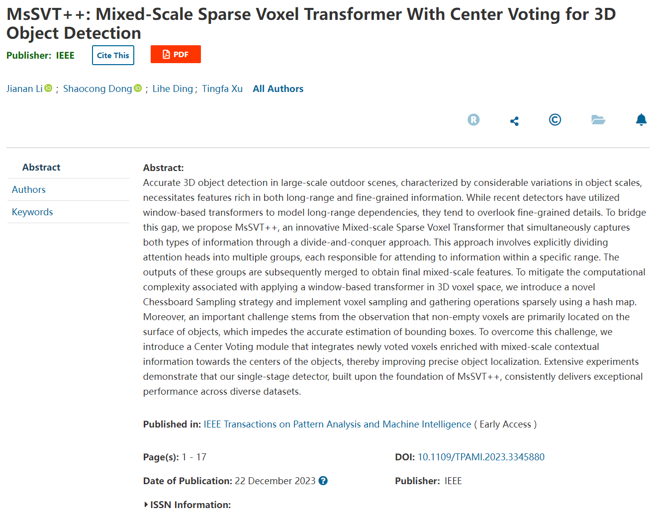论文详情:J. Li, S. Cong, L. Ding and T. Xu, MsSVT++: Mixed-scale Sparse Voxel Transformer with Center Voting for 3D Object Detection, in IEEE Transactions on Pattern Analysis and Machine Intelligence, doi: 10.1109/TPAMI.2023.3345880.