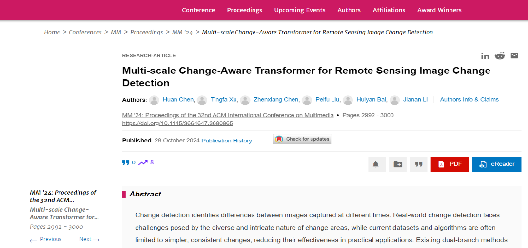 论文详情:Huan Chen, Tingfa Xu, Zhenxiang Chen, Peifu Liu, Huiyan Bai, and Jianan Li. 2024. Multi-scale Change-Aware Transformer for Remote Sensing Image Change Detection. In Proceedings of the 32nd ACM International Conference on Multimedia (MM '24). Association for Computing Machinery, New York, NY, USA, 2992–3000. //doi.org/10.1145/3664647.3680965