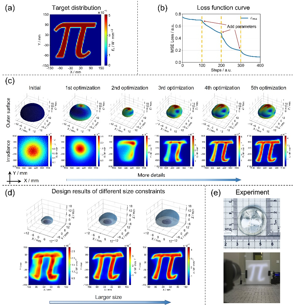 该方法设计效率高,设计过程对初始结构的依赖性较低,所设计的透镜光能利用率高,不仅能够实现复杂辐照度分布形式,还能在透镜尺寸和调控效果之间进行权衡。该研究在半导体光源集成、新能源汽车车灯、自动检测照明等领域具有极高的应用价值。