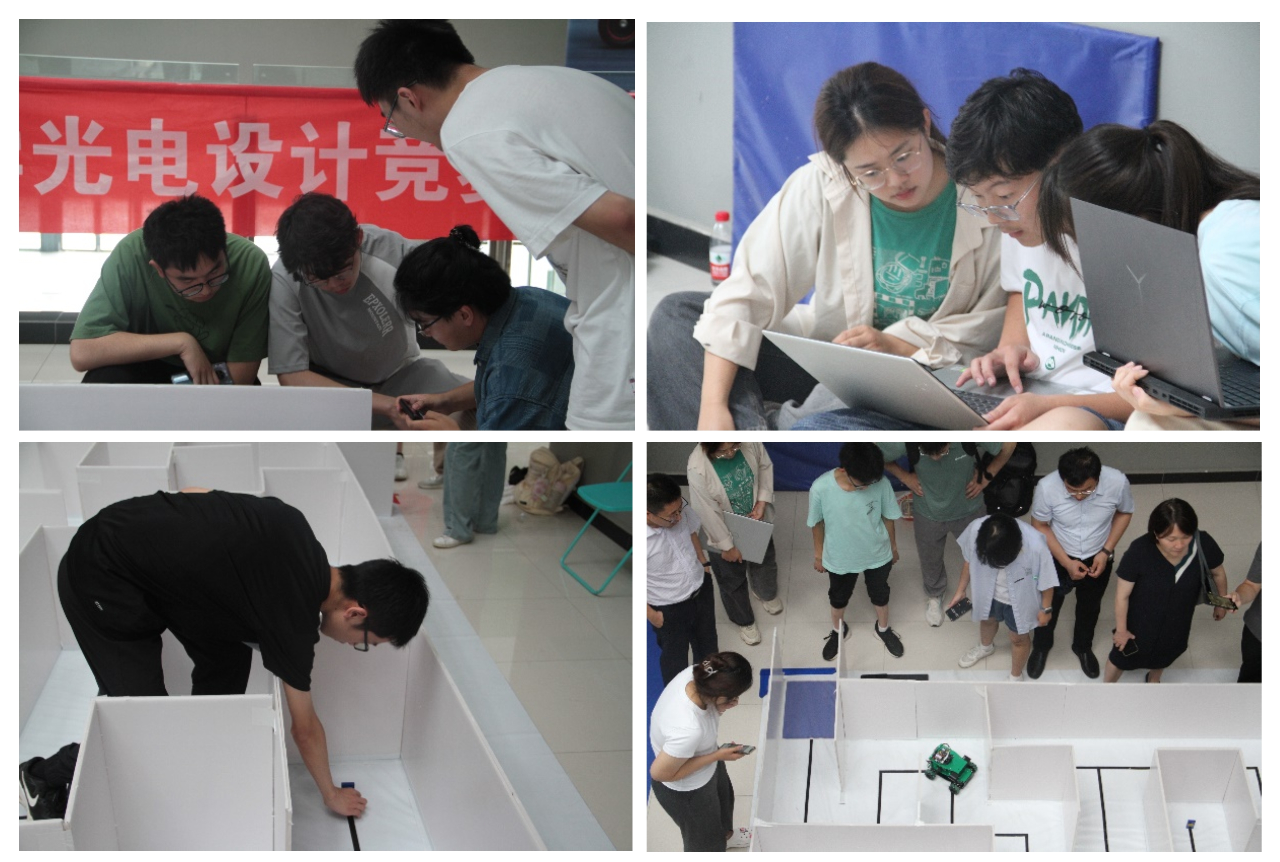 实物赛在工训楼分两个赛题分别在两个赛场举行。赛场上,参赛队之间的角逐如火如荼,裁判员们紧张有序,分工协作,经过近4个小时的几轮对决,最终“get酒精浓度队”和“动力足迹”两支队伍分别拔得赛题一“酒精浓度的非接触测量”和赛题二“‘迷宫寻宝’光电智能小车”的头筹。