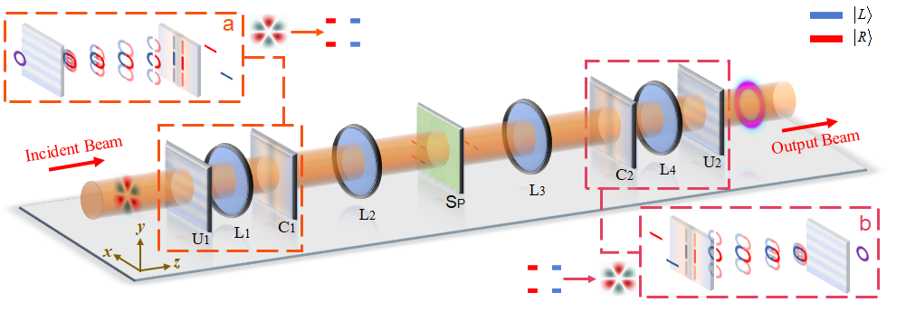 相关研究表明,旋转运动的物体携带角动量,而角动量不仅存在于宏观尺度的物体中,也存在于光子等微观粒子中。光子所包含的角动量有两种不同的形式:自旋角动量(SAM)和轨道角动量(OAM)。而光子总角动量(TAM)是傍轴近似下光子SAM与OAM的总和,它提供了两个自由度,在激光雷达、激光加工、光通信、光计算、量子信息等前沿领域应用前景广阔。光子TAM态的有效识别与按需控制是其应用的重要基础,然而现有光子TAM态识别方法仍存在动态范围有限、识别精度低等问题,且无法按需调控滤波,制约了其应用发展。