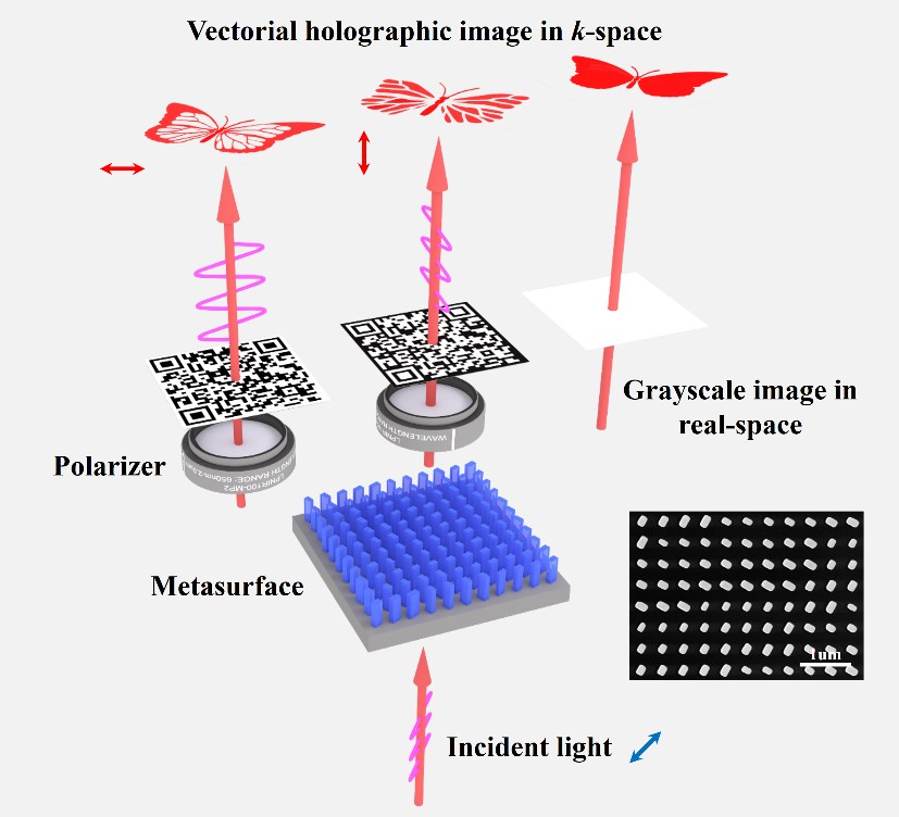 随着超颖表面全息技术的不断发展,研究人员希望利用同一个超颖表面尽可能多的再现出不同的预设独立图像。通过提高全息图的信息容量,促进超颖表面在光学防伪与加密、信息存储等领域得到更广泛的应用。针对这一问题,黄玲玲教授团队通过对超颖表面每个单元所对应琼斯矩阵的本征值和本征矢量进行分析,定制每个像素的琼斯矩阵,实现对出射光偏振和相位的同时调控。在特定偏振态的入射光照射下,利用出射光束不均匀的偏振态分布基于马吕斯定律能够在时空间实现灰度图像的存储。并且,清晰的灰度图像只有通过检偏器才能够观察到。同时,出射光束不同偏振分量所携带的相位信息,在动量空间能够实现矢量全息图像的再现,其偏振特征也需利用检偏器才能够提取出来。该本方法有助于提高全息图的信息容量,可应用于矢量全息、动态全息显示、信息存储以及光学防伪和光学加密等应用场合。