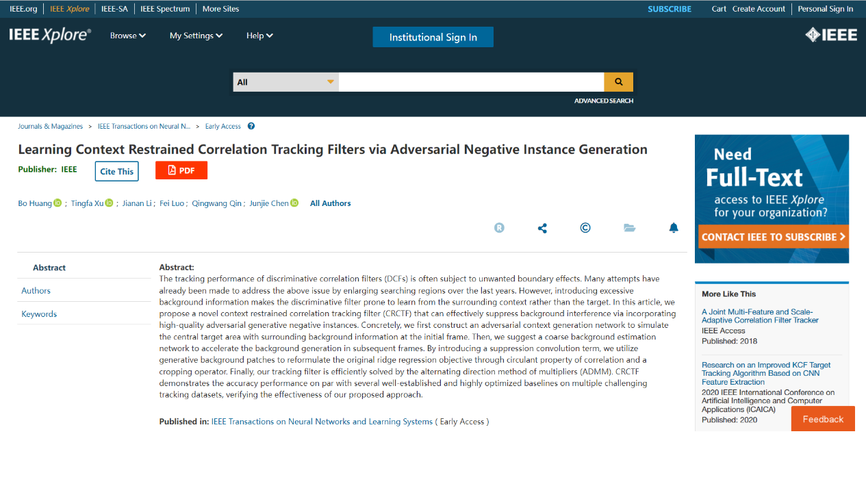 论文详情:Bo Huang, Tingfa Xu, Jianan Li, Fei Luo, Qingwang Qin, Junjie Chen, "Learning Context Restrained Correlation Tracking Filters via Adversarial Negative Instance Generation[J]", IEEE Transactions on Neural Networks and Learning Systems, 2021, doi: 10.1109/TNNLS.2021.3133441.