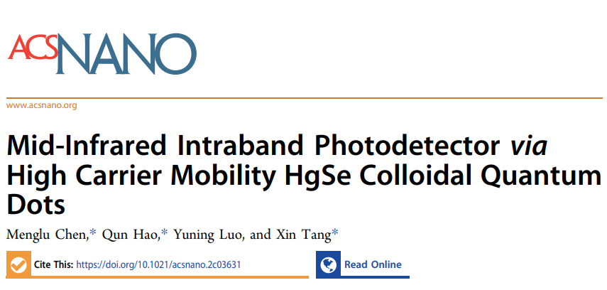91自拍 郝群教授团队成员陈梦璐准聘教授、唐鑫教授在《ACS NANO》期刊上发表了题为“Mid-Infrared Intraband Photodetector via High Carrier Mobility HgSe Colloidal Quantum Dots”的文章,利用低成本胶体量子点导带中1Se到1Pe的能级跃迁,实现低成本中波红外带内跃迁探测。