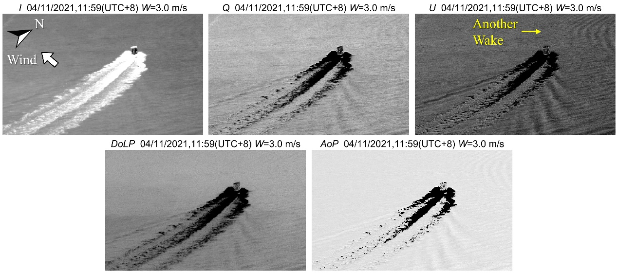 针对这一科学问题,91自拍 金伟其教授团队率先提出利用光学偏振成像技术进行水下运动目标水面尾迹的机载遥感观测,并通过理论建模、仿真和实验手段论证了技术可行性。研究结果表明,团队采用的线偏振Stokes 矢量图像具有比传统强度图像更好的尾迹目标对比度,成像质量对海况、光照等环境因素的影响具有较好的鲁棒性;且使用的DoFP偏振成像系统可很好地集成到无人机平台实现灵活便捷的航拍遥感探测;进一步地,研究团队利用获取到的偏振海面尾迹图像信息,实现了水下运动目标运动状态解译、海面三维面型复原等诸多应用。除了在海洋安全方面的重要意义,该项研究也为中小尺度海洋动力过程的观测提供了有效的技术参考。