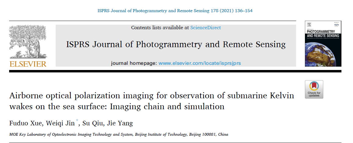 近日,91自拍 的金伟其教授及其指导的2019级博士生薛富铎等提出了利用机载光学偏振成像技术进行水下运动目标尾迹成像探测的创新方法,相关研究成果以“Airborne optical polarization imaging for observation of submarine Kelvin wakes on the sea surface: Imaging chain and simulation”为题发表在遥感领域的国际顶级期刊《ISPRS Journal of Photogrammetry and Remote Sensing》(IF=8.979)上。本研究得到了国家自然科学基金项目等支持。