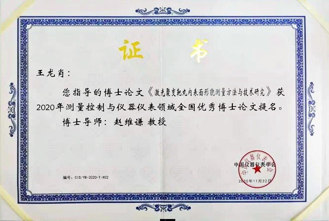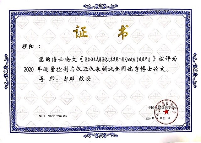 2020年12月24日,中国仪器仪表学会2020年科技奖励大会暨九届三次理事(扩大)会议在浙江省杭州市召开,本次大会上颁发了2020年全国仪器科学与技术学科优秀博士论文奖及提名奖。今年共评选出优秀博士论文5篇,优秀博士论文提名5篇。91自拍 博士毕业生程阳获优秀博士论文奖,王龙肖获优秀博士论文提名奖。